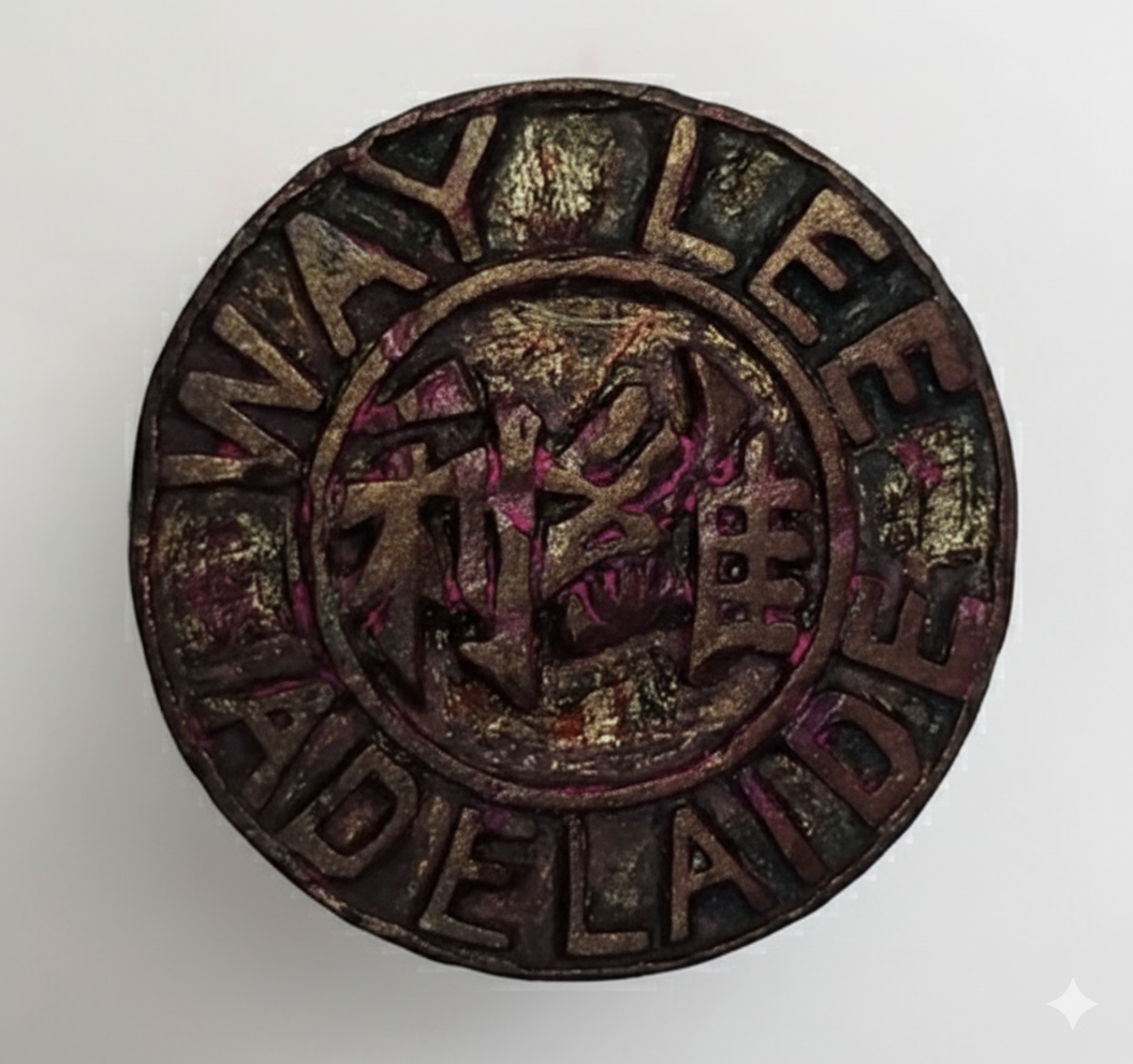 Yett Soo War Way Lee immigrated to Sydney from Dongguan in 1874 and, by 1878, had established Way Lee & Co., an importing business at 145 Hindley Street in Adelaide that grew into a substantial enterprise with branches in South Australia and New South Wales. Trading in tea, fireworks, porcelain, bric-a-brac, and Chinese medicines, Way Lee became a respected figure in South Australian business circles despite facing persistent anti-Chinese sentiment and discrimination. He played a prominent civic role, including service on a famine relief committee for which Adelaide City was gifted an Imperial Board, and in 1887, during a journey to China, he acquired an official Qing government title as a fourth-rank Mandarin in recognition of his service to overseas Chinese communities. The firm’s identity was marked by a button inscribed “Way Lee Adelaide” in English on the outer circle and 維利 in Chinese on the inner circle, and in 1900 Way Lee publicly articulated his views by publishing an open letter in the South Australian Register titled “The Chinese Question from a Chinaman’s point of view.”