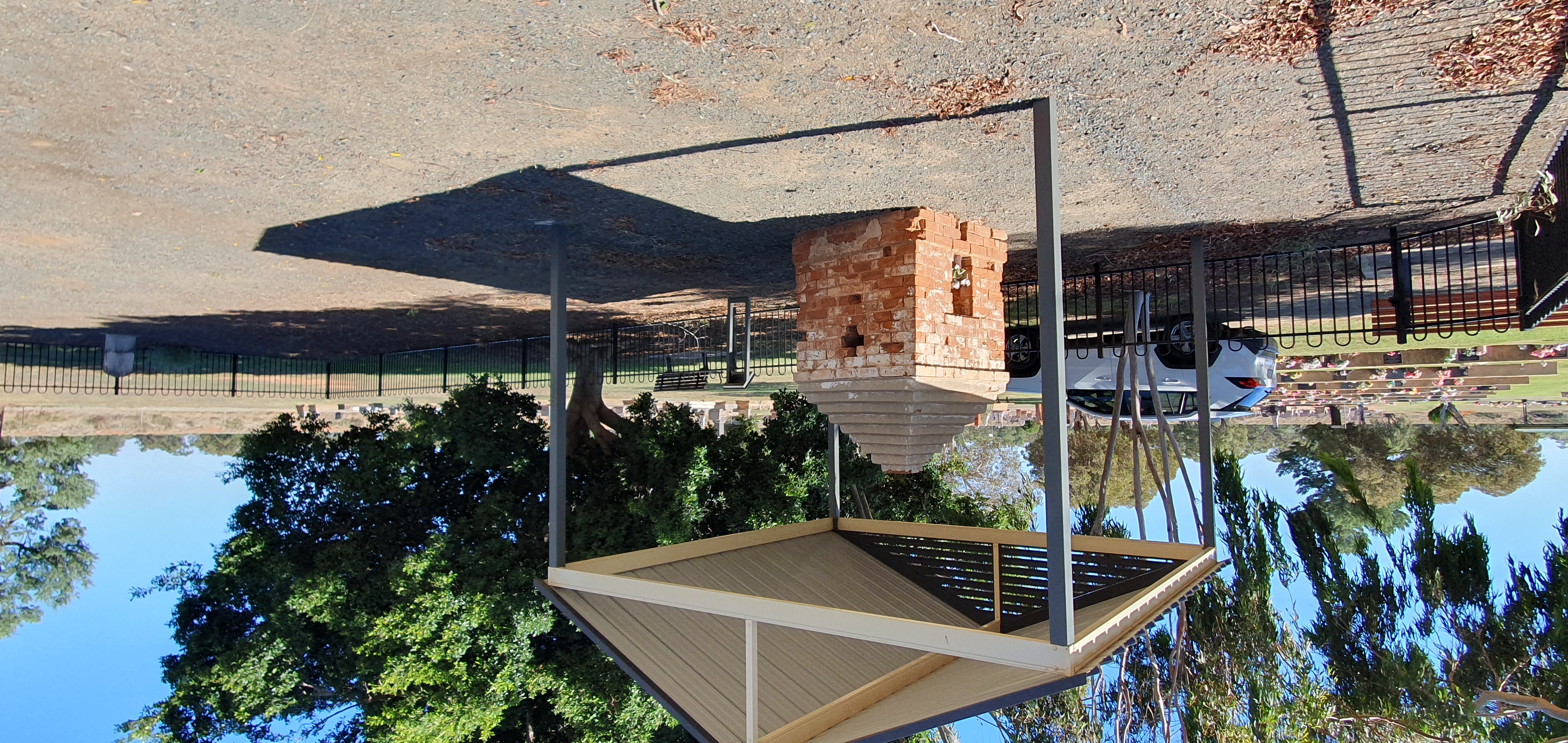 The burner is of brick construction with a square footprint of 2100mm, it stands 2150mm high and has a stepped roof of nine brick courses. On the north side an opening has been created by leaving out six horizontally arranged bricks. The opening allows access to a metal grated area where offerings can be placed for incineration. The grate is raised off the ground to allow air to flow underneath. Vents in the remaining three sides have been formed by leaving out two half and one whole brick. The burner tapers to a single brick size hole (flue) at the top.