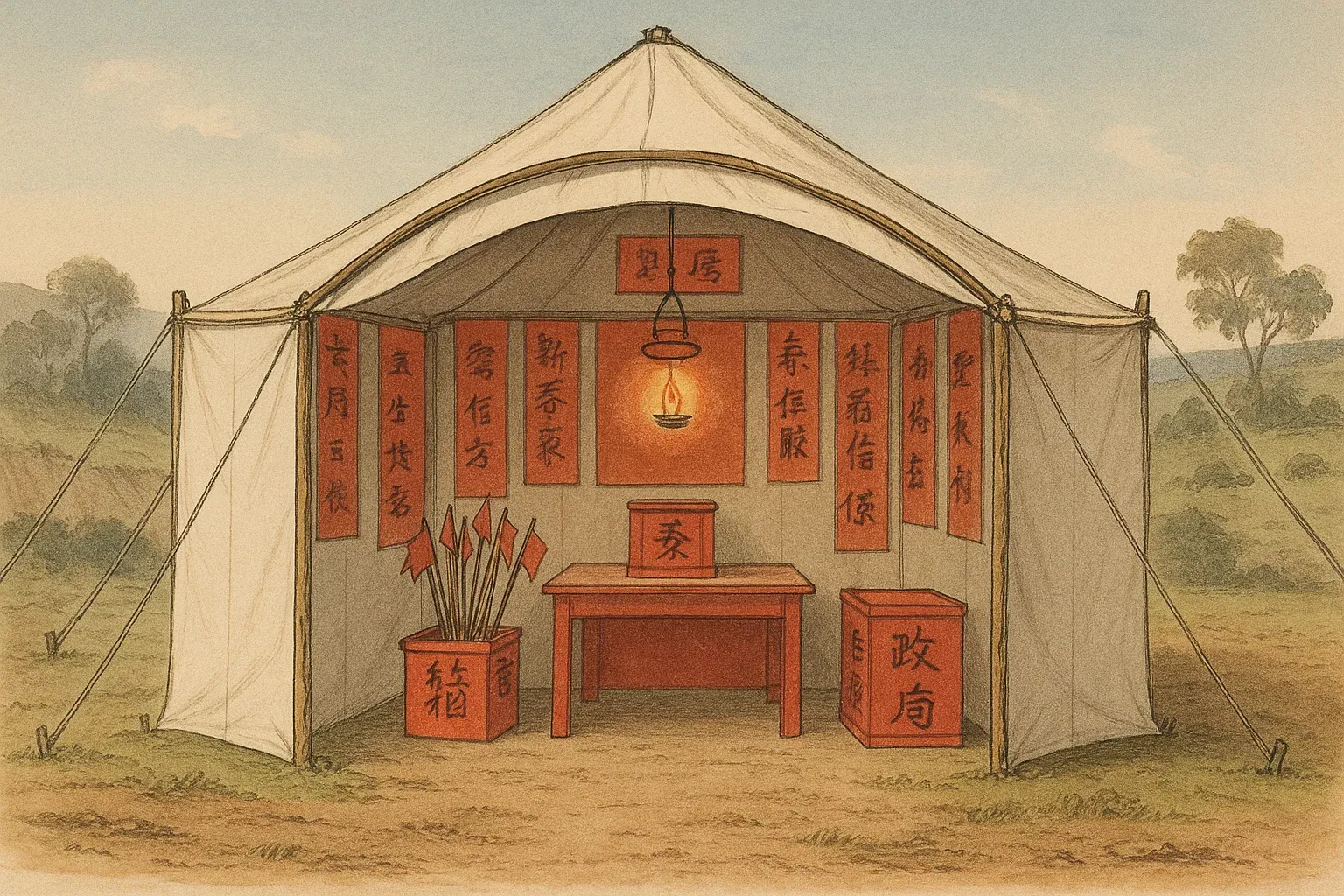 CHINESE JOSS-HOUSE. --- Amongst the many recent erections in the district, perhaps the most singular in many respects is the Joss-house or temple, constructed last week by some of the Chinese on Strike-a-light Flat. It is built of calico strained on poles, in the usual manner of a digger's tent, and has a very neat verandah of the same material in the front of it, with a semi-circular shaped roof. On entering the penetralia the fantastic taste of the celestials is very apparent, a number of red pieces of calico, with Chinese characters inscribed, may be seen at each side and over the altar, if such be the proper term to apply to