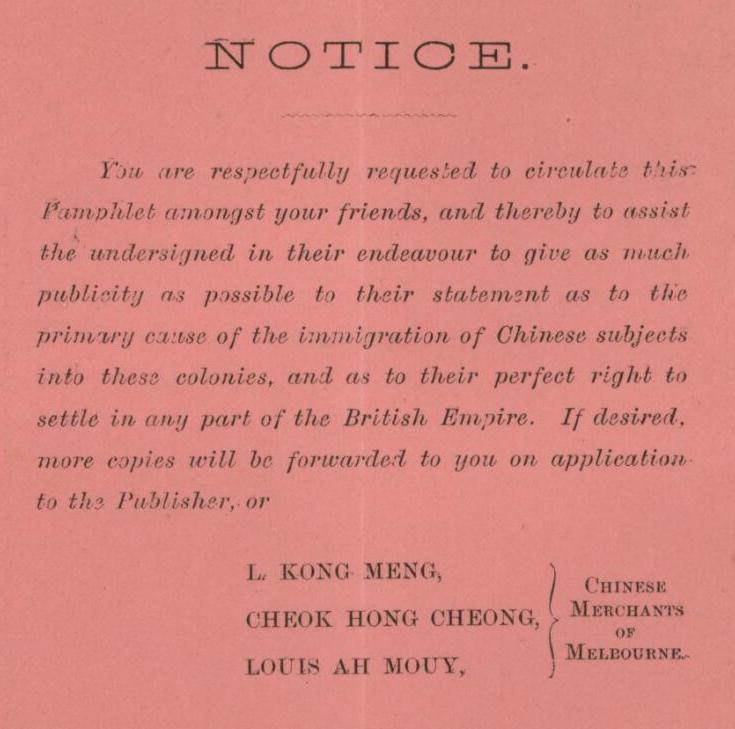 “… we appeal, as natives of China and as citizens of Victoria, to the reason, the justice, the right feeling, and the calm good sense of the British population of Australia”.