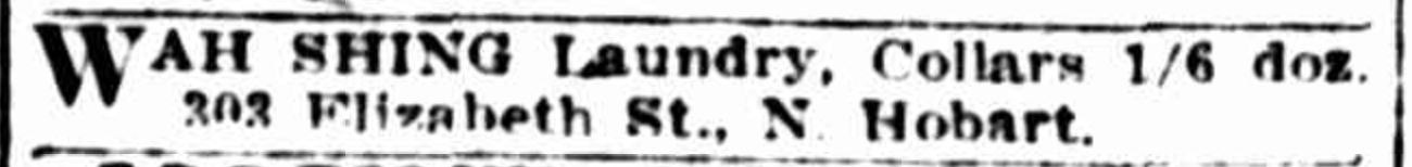 Wah Shing Laundry operated for many years in Hobart. The building is now occupied by a Chinese restaurant.