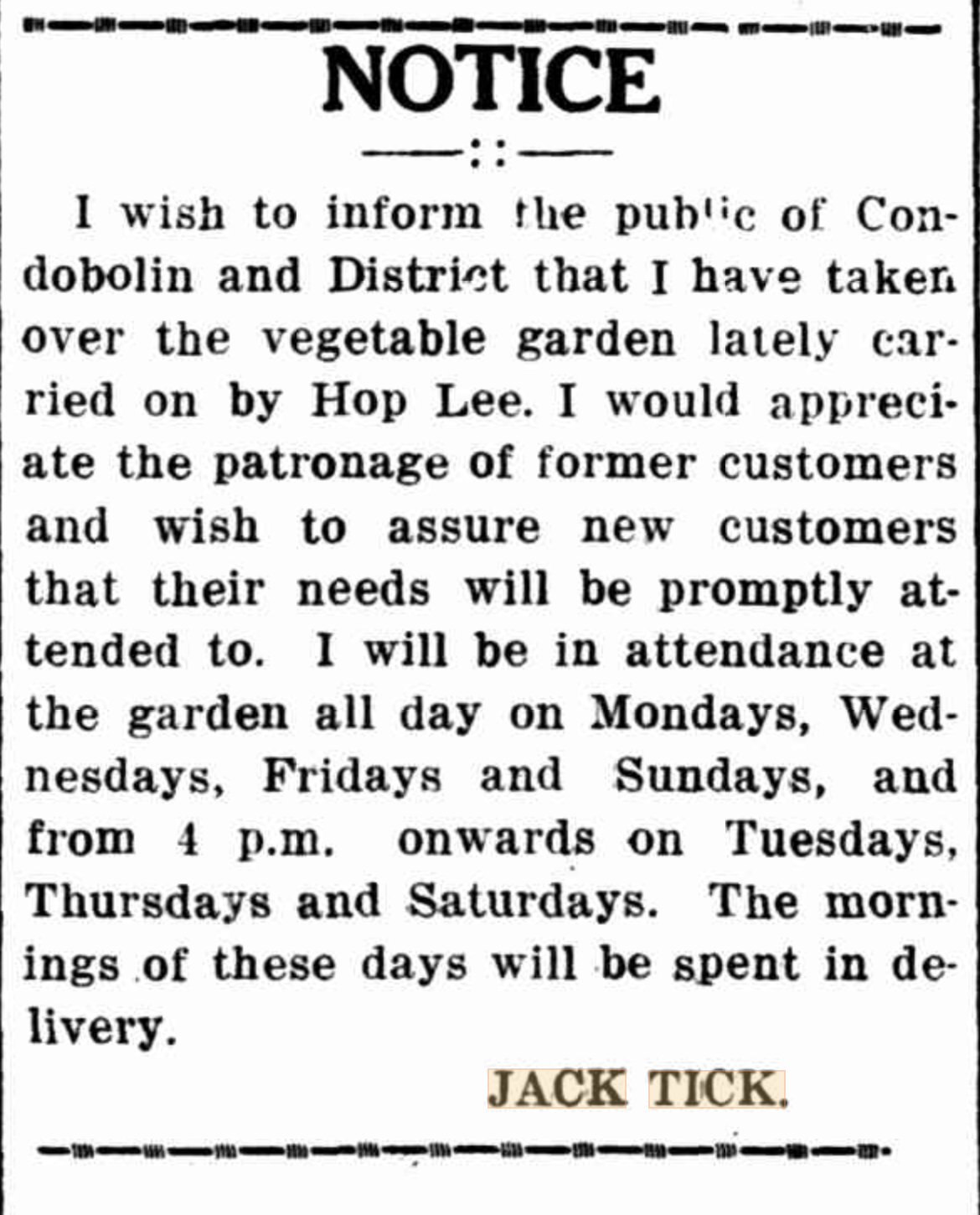 Jack Tick was a long time resisient of the Condobolin area. He was involved in scrub cutting and skin and wool buying before settling down as a market gardener. He was involved in a number of assaults before becoming a well known and remembered figure in Condobolin. Perhaps one of the last of the Chinese men in that town.