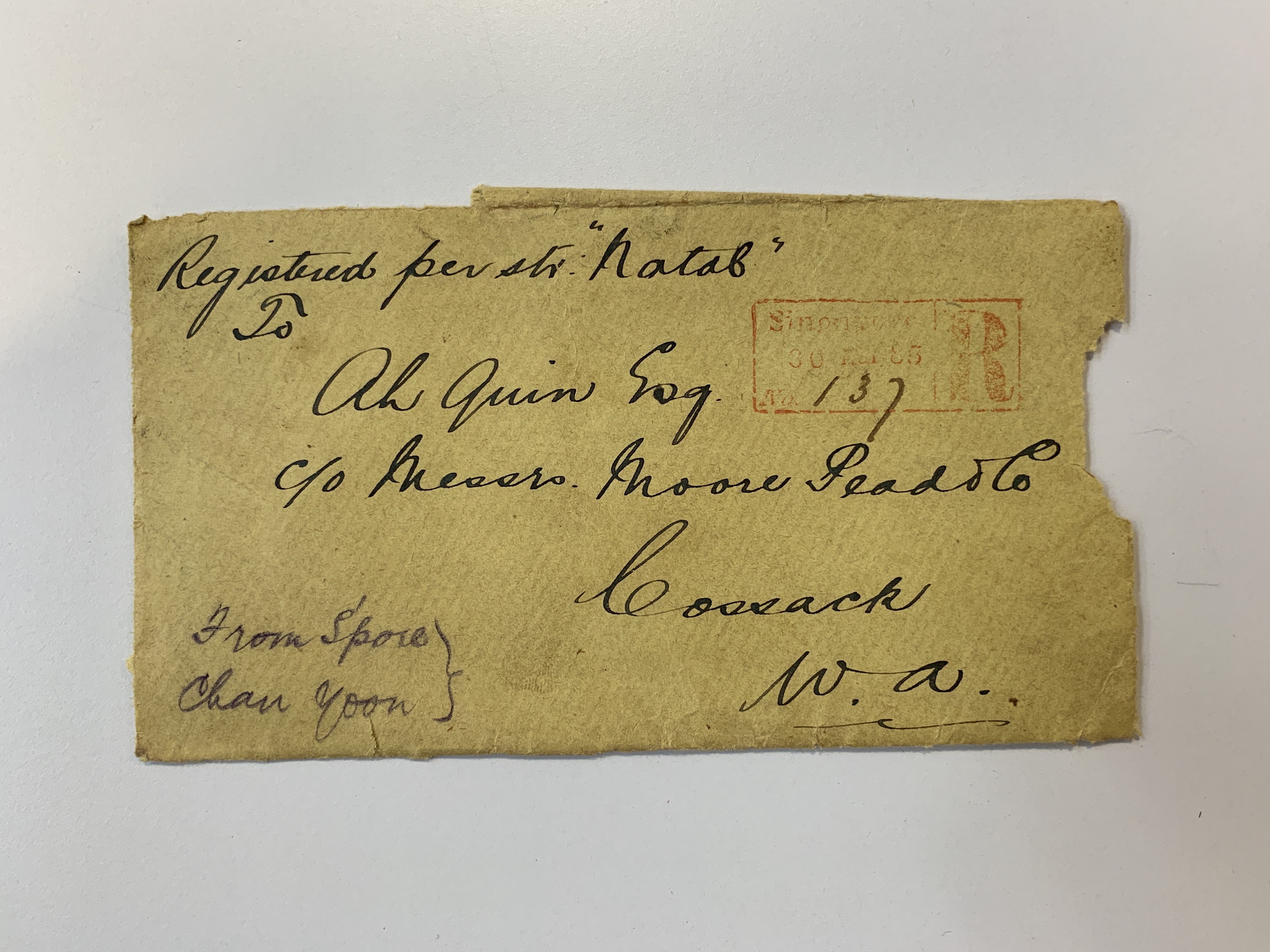 Letters written in Chinese and shipping documents show that Ah Quan kept up a correspondence with both Singapore and Hong Kong from where he ordered his goods, often via a Choon Fatt for shipping on the coastal steamer Natal. Jars of salt turnips, bags of rice, vermicelli and potatoes were common imports.